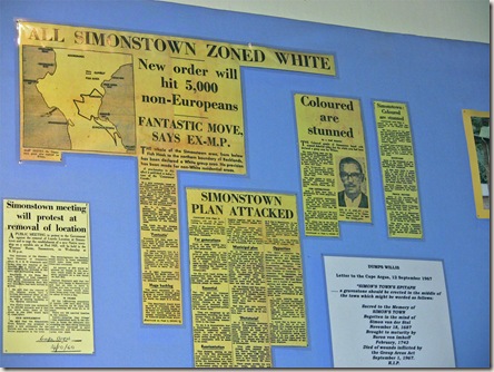 The coolest thing we did in Simon's Town, however, was to tour the local museum. It was only open from 10-1 today, so we timed it perfectly and arrived right at 10. We paid the 5 rand donation (less than a dollar) and walked around this small town museum that was run by volunteers. But it turned out to be a fascinating place. We learned about slavery in the early years of Cape Town. We learned about the sailors who came in to port, and the origin of the word "grog." We also learned about a dog named Just Nuisance who was inducted into the Royal Navy, and was even given a full military burial when he died. All of this was very interesting, but the best part of the whole museum was the display about the forced removal of non-whites in the 1960s. We had learned about this when we went to the District 6 museum, but at Simon's Town, you saw it from the perspective of this small town that had always included people from all racial groups. This community worked, played and worshipped together, and many civic leaders wrote letters of protest about the removal and how it would tear apart their community. The display also showed newspaper clippings that helped explain how the forced removals were presented in the press. The people who were being moved were given brand new homes that were twice the size of the homes they left. The expectation was that they would be grateful for the opportunity to go to a new home. What wasn't mentioned is that the new neighborhoods had no schools, no stores, no easy access to transportation, and would require people to travel over 2 hours to get to their jobs. The more I learn about apartheid, the more I realize how complicated it was, and I begin to see how so many people could actually delude themselves into thinking it would work.
